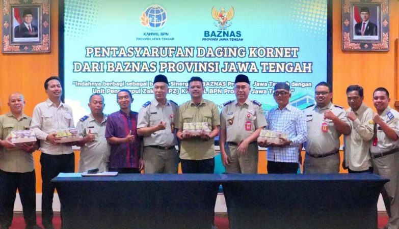 Semarang — Kantor Wilayah Badan Pertanahan Nasional Provinsi Jawa Tengah melaksanakan kegiatan pentasyarufan daging kornet dari Badan Amil Zakat Nasional (BAZNAS) Provinsi Jawa Tengah kepada