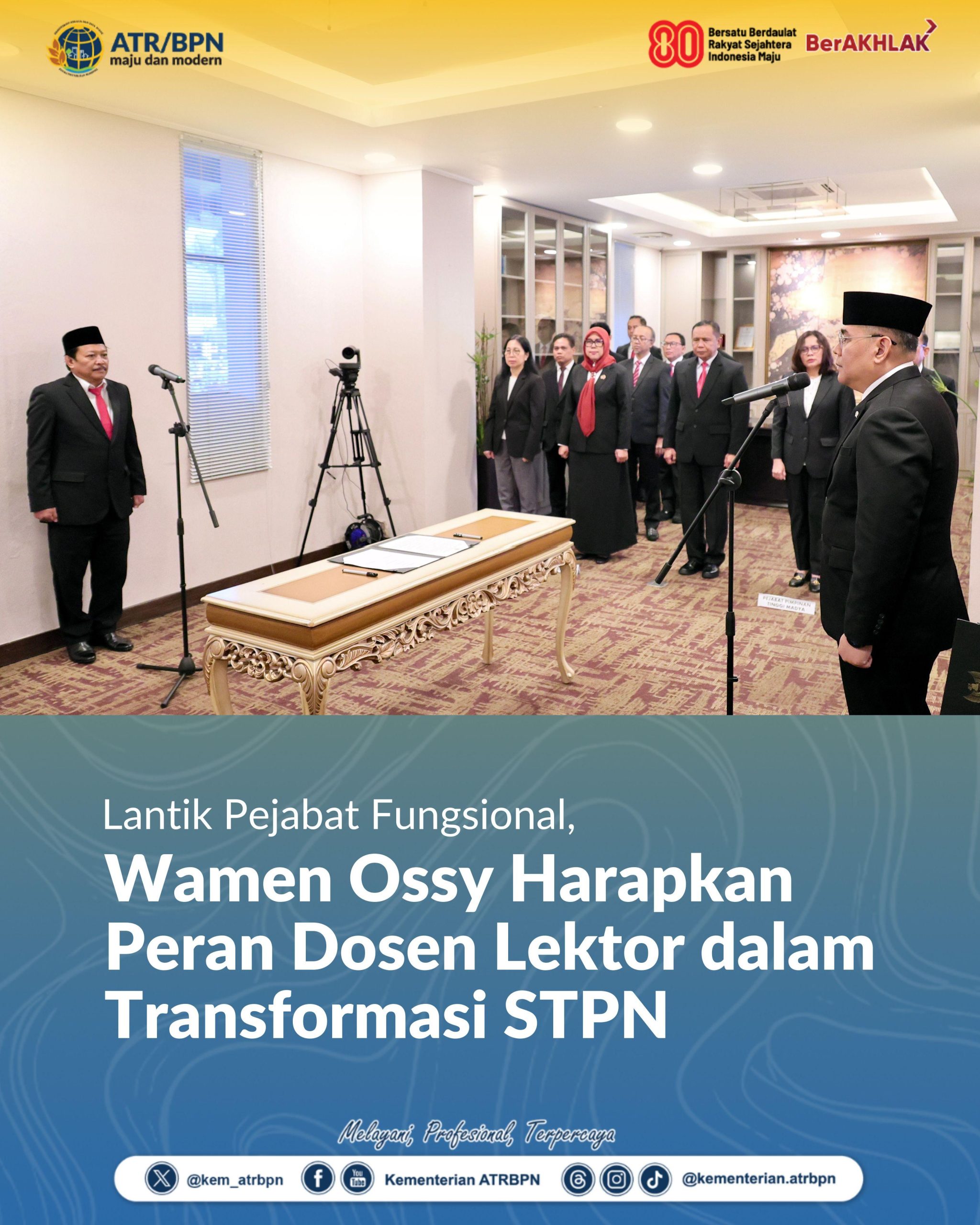 Jakarta – Wakil Menteri Agraria dan Tata Ruang (Wamen ATR)/Wakil Kepala Badan Pertanahan Nasional (Waka BPN), Ossy Dermawan, melantik Pejabat Fungsional Dosen Lektor pada Sekolah Tinggi Pertanahan Nasional (STPN), Kamis (28/08/2025). Wamen Ossy menaruh harapan besar kepada pegawai terlantik untuk mentransformasikan ilmu pengetahuan sebagai seorang pendidik bagi para penerus bangsa.