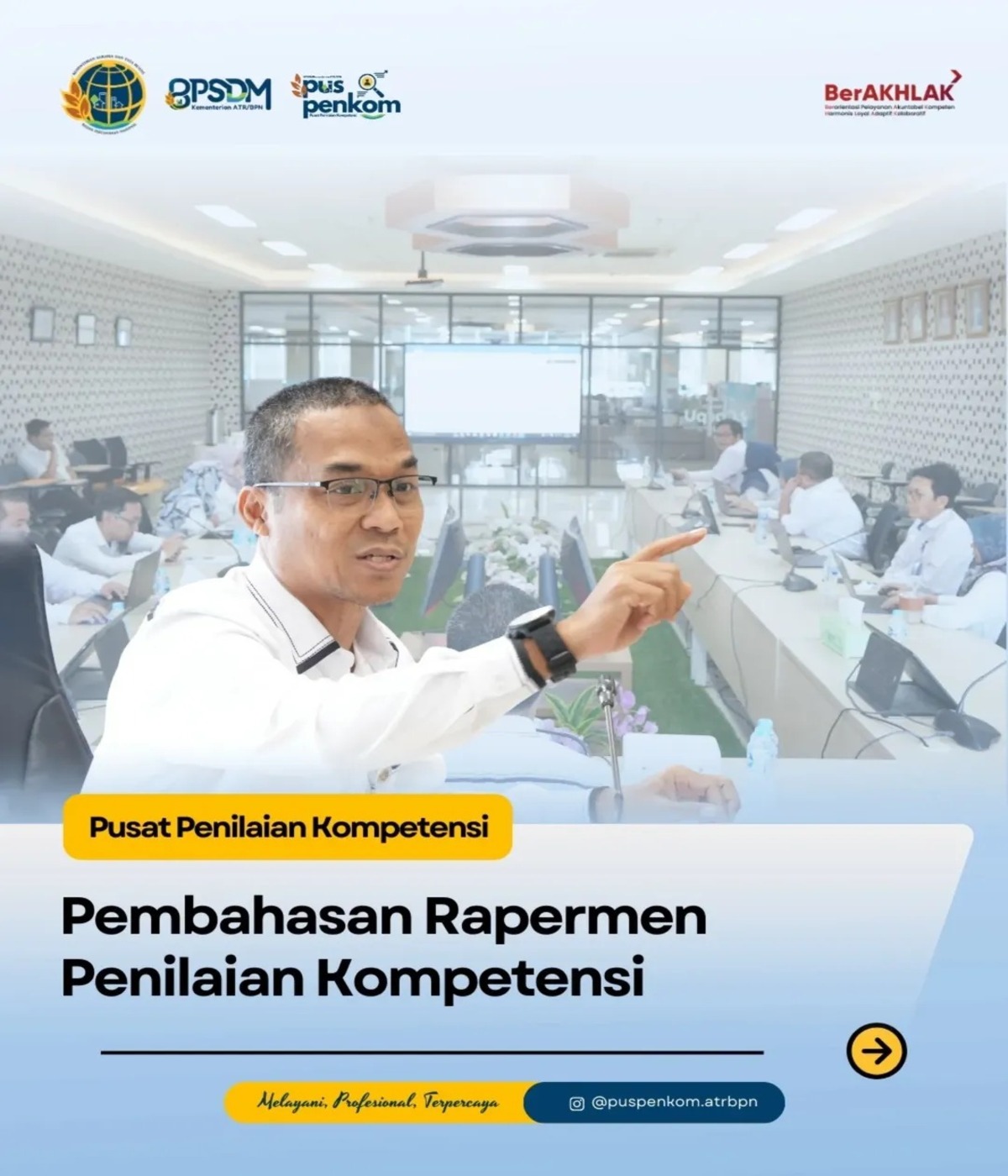 Jakarta – Pusat Penilaian Kompetensi (Puspenkom) Kementerian Agraria dan Tata Ruang/Badan Pertanahan Nasional (ATR/BPN) melaksanakan pembahasan Rancangan Peraturan Menteri (Rapermen) tentang Penilaian Kompetensi sebagai langkah strategis dalam penyempurnaan regulasi yang akan menjadi landasan pelaksanaan penilaian kompetensi di lingkungan Kementerian ATR/BPN.