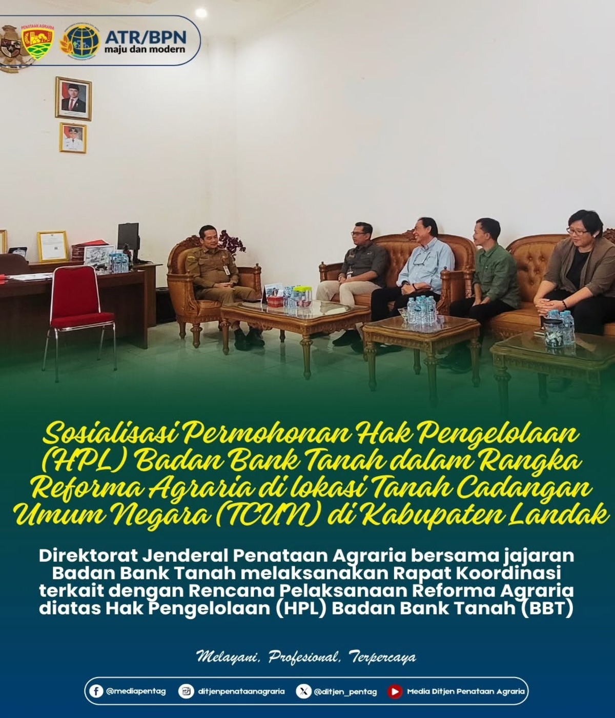 Direktorat Jenderal Penataan Agraria dalam hal ini diwakili oleh Kepala Subdirektorat Pengelolaan Penguasaan, Pemilikan, Penggunaan dan Pemanfaatan Tanah (P5T) bersama jajaran Badan Bank Tanah serta jajaran melaksanakan Rapat Koordinasi terkait dengan Rencana Pelaksanaan Reforma Agraria diatas Hak Pengelolaan (HPL) Badan Bank Tanah (BBT) di Kabupaten Landak yang berasal dari Tanah Cadangan Umum Negara (TCUN) HGU No 1 PT Kebun Aria di Ruang Sekretariat Daerah Kabupaten Landak (10/02/2026). Rapat ini bertujuan untuk sosialisasi rencana pelaksanaan RA diatas HPL Badan Bank Tanah pada lokasi TCUN yang diperuntukan untuk BBT akan dikelola dan dimanfaatkan untuk kepentingan Reforma Agraria dan kepentingan lainnya.
