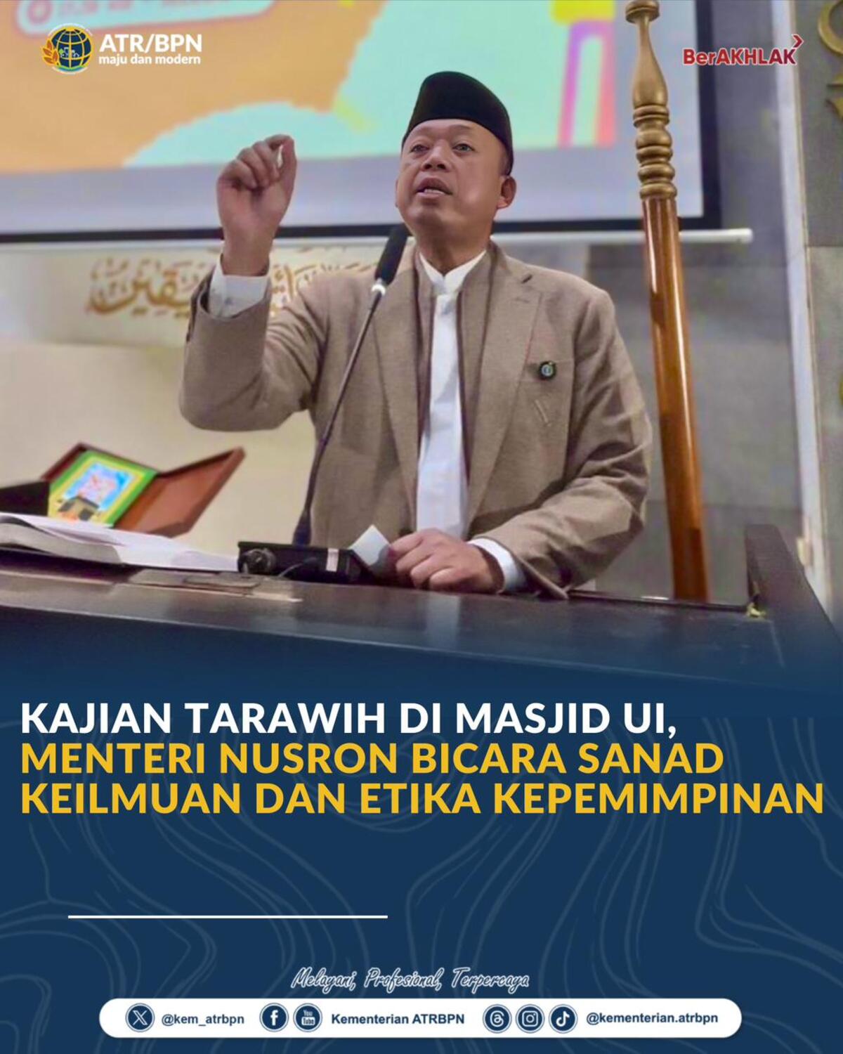 Depok – Menteri Agraria dan Tata Ruang/Kepala Badan Pertanahan Nasional (ATR/BPN), Nusron Wahid, menekankan pentingnya sanad keilmuan sebagai fondasi berpikir sekaligus etika kepemimpinan dalam merumuskan kebijakan publik. Hal itu ia sampaikan kepada alumni Universitas Indonesia (UI) dan jemaah yang mengikuti Kajian Tarawih di Masjid Ukhuwah Islamiyah, UI, Depok pada Senin (23/02/2026).