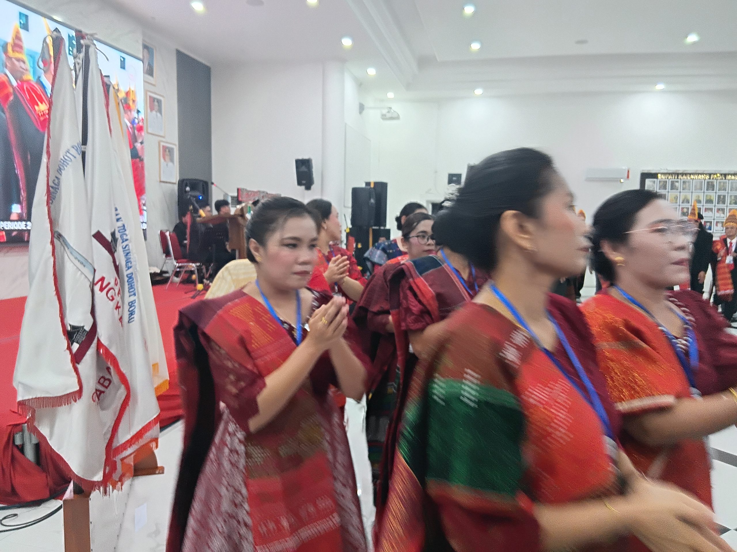 Rangkaian acara diawali dengan kebaktian syukur, dilanjutkan dengan prosesi pelantikan yang berlangsung tertib dan penuh makna. Para pengurus yang dilantik mengenakan busana adat Batak yang dipadukan dengan pakaian formal, menghadirkan nuansa budaya yang kental namun tetap berwibawa.