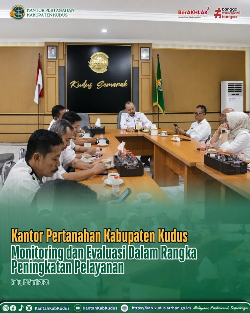 Kudus, Rabu (15/04/2026) – Dalam rangka meningkatkan kualitas pelayanan kepada masyarakat, Kantor Pertanahan melakukan evaluasi menyeluruh terhadap pelaksanaan layanan di berbagai unit kerja, khususnya pada loket pelayanan, Seksi Survei dan Pemetaan, Subbagian Tata Usaha, serta seksi teknis lainnya.