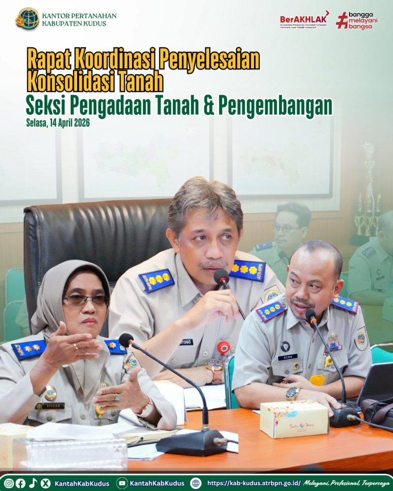 Semarang, 14 April 2026 — Kantor Pertanahan Kabupaten Kudus menghadiri undangan Rapat Koordinasi Penyelesaian Konsolidasi Tanah Desa Klumpit, Kecamatan Gebog, yang diselenggarakan di Ruang Merapi, Kantor Wilayah Badan Pertanahan Nasional (BPN) Provinsi Jawa Tengah, Selasa (14/04).