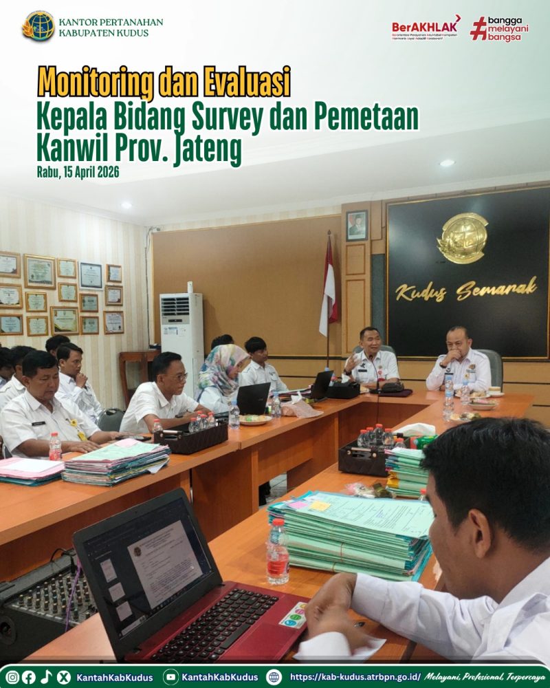 Rabu, 15 April 2026 – Kantor Pertanahan Kabupaten Kudus menerima kunjungan dari Kantor Wilayah BPN Provinsi Jawa Tengah dalam rangka pembinaan, monitoring, dan evaluasi kinerja. Kegiatan ini dipimpin oleh Kepala Bidang Survei dan Pemetaan Kantor Wilayah BPN Provinsi Jawa Tengah, Bp. Yan Septedyas, ST., SH., dan dilaksanakan di ruang rapat Kantor Pertanahan Kabupaten Kudus.