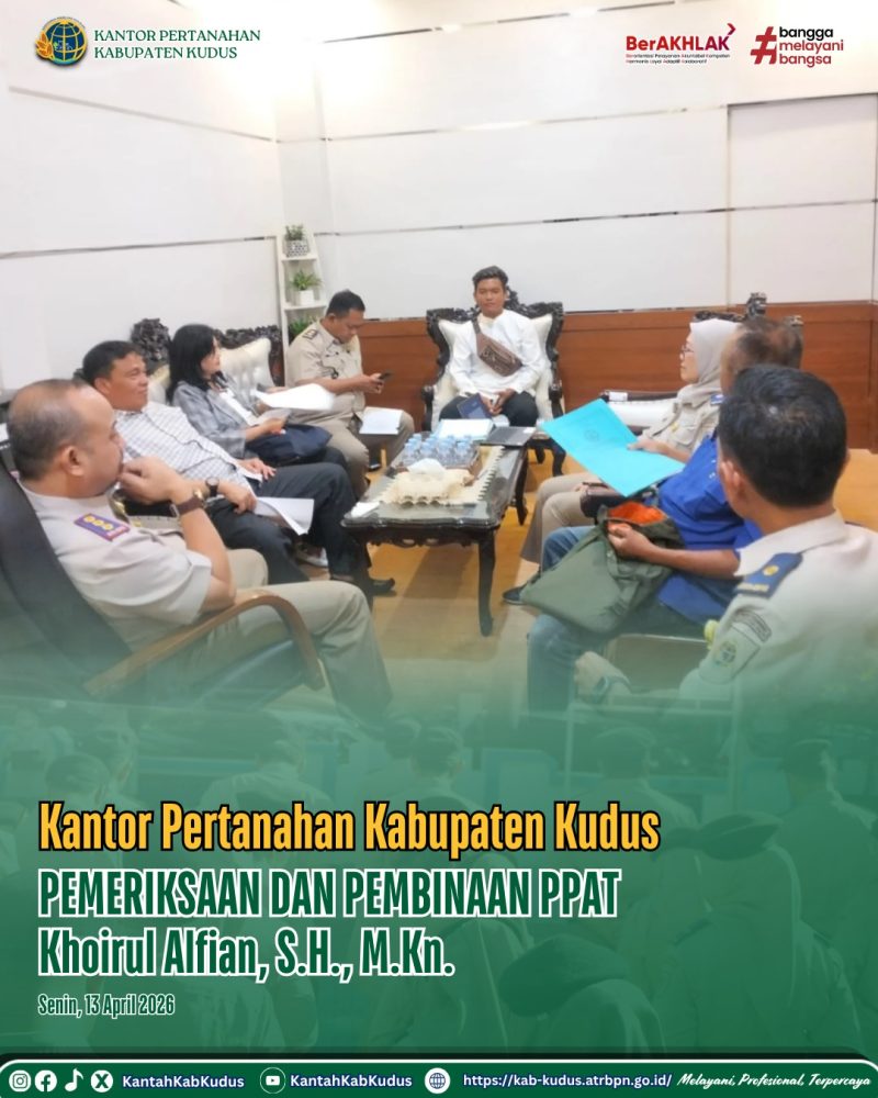 Kudus – Kantor Pertanahan Kabupaten Kudus melaksanakan kegiatan pemeriksaan dan pembinaan terhadap Pejabat Pembuat Akta Tanah (PPAT) atas nama Khoirul Alfian, S.H., M.Kn., pada Senin (13/04/2026).