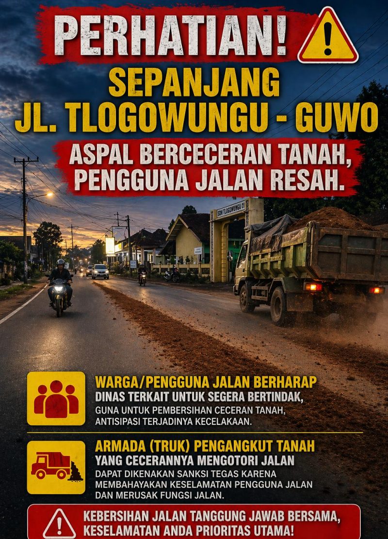 ‎Dengan hal tersebut banyak dirasakan pengguna jalan yang saat ini melintasi dari sepanjang jalan Tlogowungu menuju Desa Guwo. Sehingga mereka resah dengan keadaan jalan yang penuh tanah berceceran, karena dapat mengancam keselamatan. Mereka harus ekstra hati – hati untuk menghindari terjadinya kecelakaan.