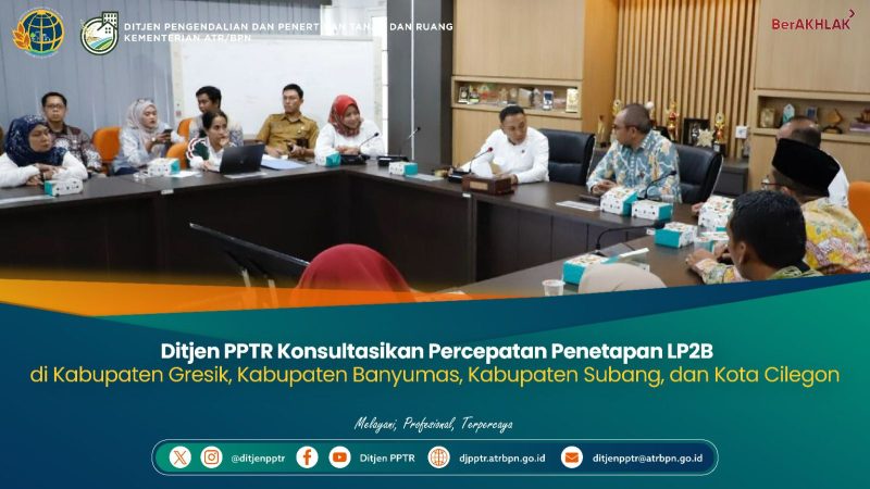 Jakarta – Direktorat Jenderal Pengendalian dan Penertiban Tanah dan Ruang (PPTR), Kementerian Agraria dan Tata Ruang/Badan Pertanahan Nasional (ATR/BPN) gelar rapat koordinasi percepatan penetapan Lahan Pertanian Pangan Berkelanjutan (LP2B) bersama Pemerintah Kabupaten Gresik, Banyumas, Subang, dan Kota Cilegon pada Selasa, (7/4/2026).