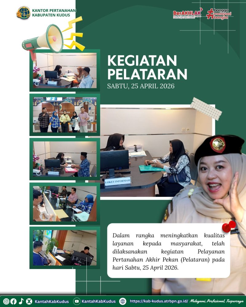 Dalam rangka meningkatkan kualitas layanan kepada masyarakat, telah dilaksanakan kegiatan Pelayanan Pertanahan Akhir Pekan (Pelataran) pada hari Sabtu, 25 April 2026.