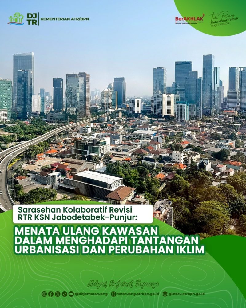 Jakarta – Direktorat Jenderal Tata Ruang Kementerian Agraria dan Tata Ruang/Badan Pertanahan Nasional (ATR/BPN), melalui Direktorat Perencanaan Tata Ruang, menyelenggarakan Sarasehan Kolaboratif Revisi Rencana Tata Ruang (RTR) Kawasan Strategis Nasional (KSN) dengan tema “Menata Ulang Jabodetabek-Punjur dalam Menghadapi Tantangan Urbanisasi dan Perubahan Iklim” pada Senin (06/05). Acara ini merupakan rangkaian pelaksanaan Kick-Off Penyusunan Revisi Materi Teknis dan Rancangan Peraturan Presiden (RPerpres) RTR KSN Kawasan Perkotaan Jabodetabek-Punjur.