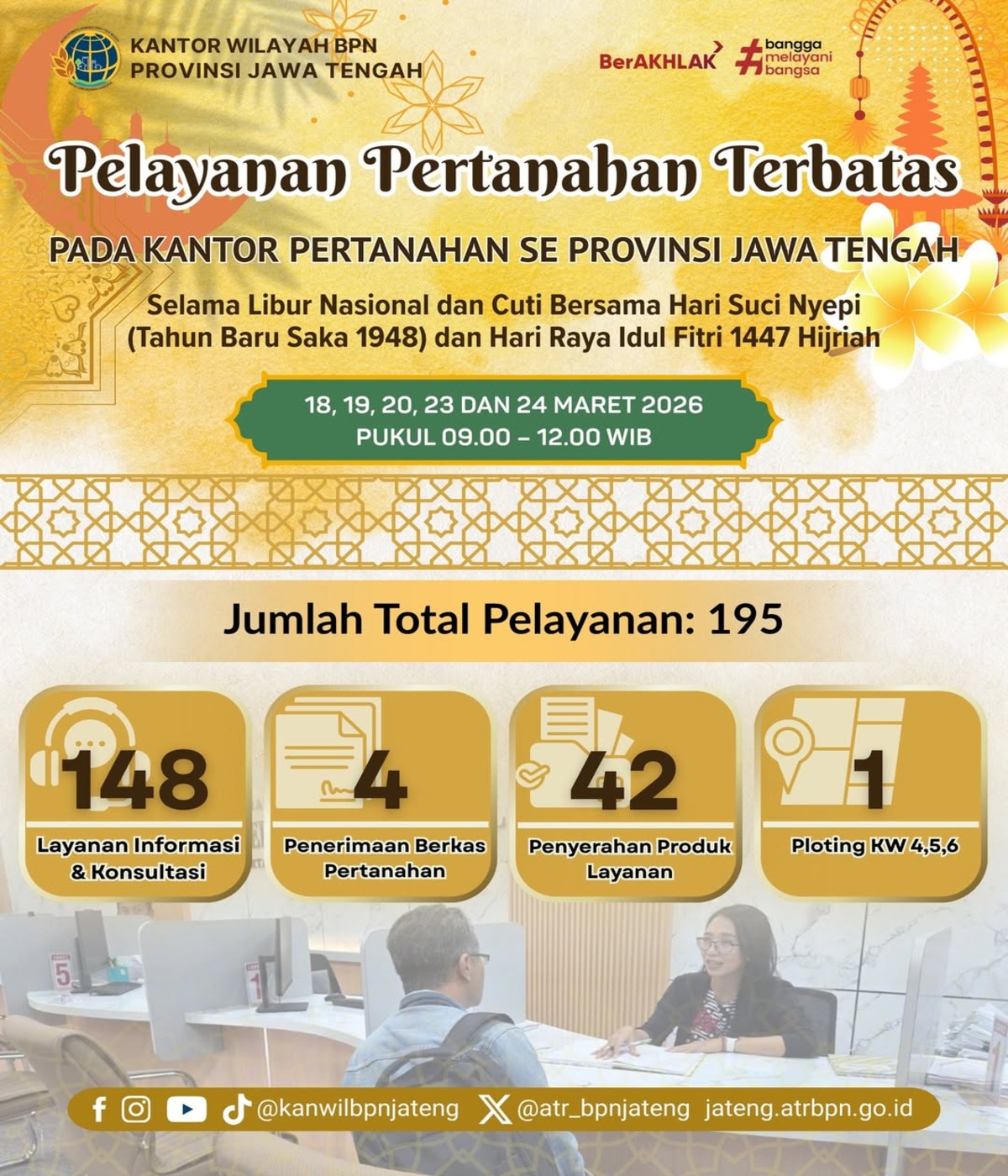Semarang – Kantor Pertanahan kabupaten/kota se-Provinsi Jawa Tengah tetap melaksanakan pelayanan pertanahan terbatas selama masa libur nasional dan cuti bersama Hari Suci Nyepi (Tahun…