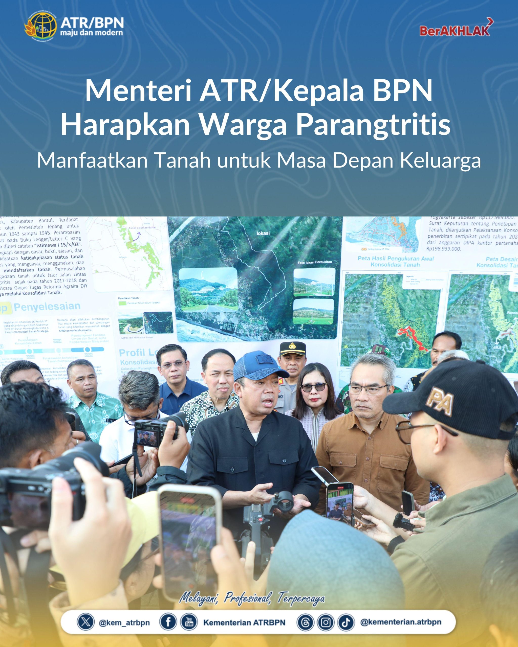 Sleman – Menteri Agraria dan Tata Ruang/Kepala Badan Pertanahan Nasional (ATR/BPN), Nusron Wahid, mengajak masyarakat Parangtritis untuk memanfaatkan tanahnya yang telah disertipikatkan sebagai bekal…
